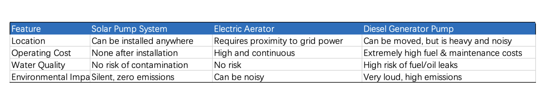 •Solar Aeration Pump: A specialized, high-volume surface pump designed to maximize water movement and oxygen transfer. It's the ideal choice for combating stratification and anoxia in fish ponds.
