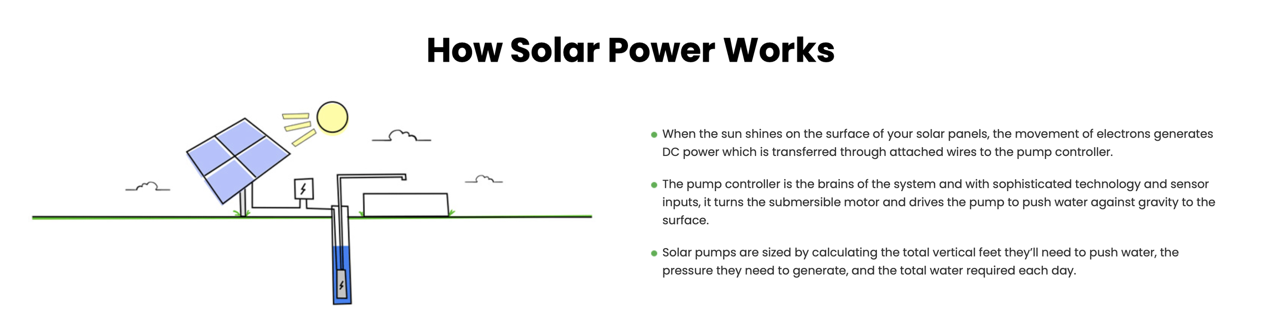 2.Pumping & Boosting: Depending on your need, either a submersible pump in your well or a surface booster pump connected to your main water line is used. The system is powered directly by the solar energy.